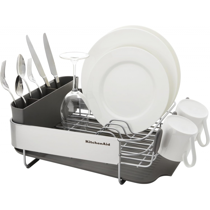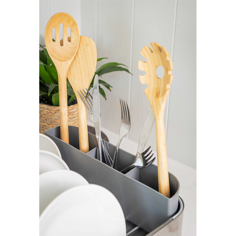 Dish rack, removable 3-compartment utensil holder and angled draining board.