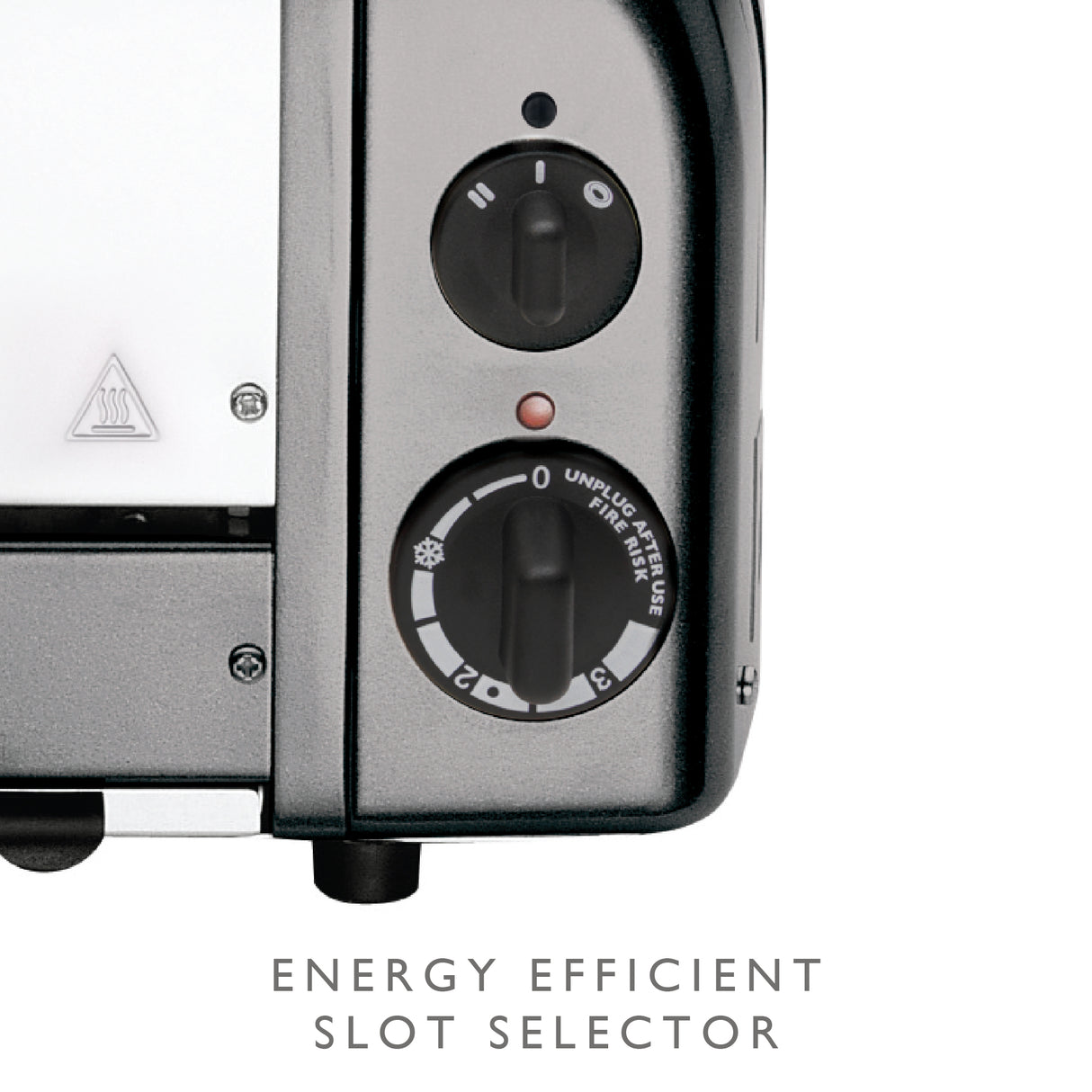 Engineered to produce the best toast in the world, the iconic Dualit Classic Toaster has been hand built in the UK since the 1950s. So whether you're a toast aficionado at home, or a professional caterer needing to produce 80 toasted sandwiches an hour, we can guarantee that one of our Classic Toasters will be perfect for you. It offers all the styling and functionality you would expect from a Dualit toaster, along with the additional features of a defrost setting for frozen bread, mechanical timer, ejector lever, and the option to toast buns and bagels. The energy-efficient slot selector control allows you to heat only what's needed, from one slot to all four slots.